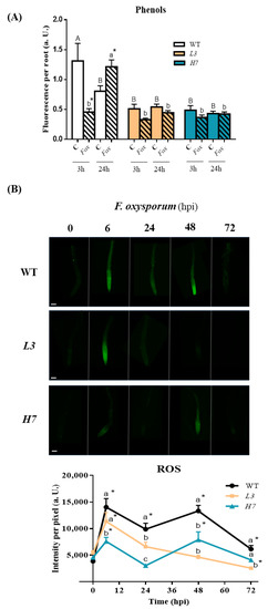 ROS and phenol accumulation in Arabidopsis roots in response to F. oxysporum. (A) Total amount of exudate phenolic compounds from WT, L3, and H7 Arabidopsis seedling roots infected (+; 3 and 24 hpi) or not (−) with F. oxysporum, determined by fluorimetry under UV light (365 nm). (B) Representative confocal microscopy images of ROS-dependent fluorescence using the fluorescent probe DCF-DA in Arabidopsis seedling roots from the different genotypes previously inoculated (6–72 hpi) or not (0 hpi) with F. oxysporum, as well as image quantification. Scale bar = 100 µm. Data represent the mean ± SEM of at least three independent experiments. Different letters denote significant differences between the genotypes at each time point according to the Tukey’s multiple comparison test (p < 0.05; capital letters for control and lowercase for infected roots). Asterisks denote significant differences with respect to the control (0 hpi) according to the Dunnett´s multiple comparison test (p < 0.05).