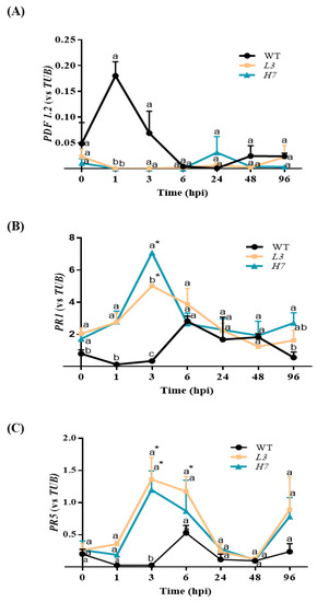 Defense responses in Arabidopsis seedlings after F. oxysporum infection. RT-qPCR analysis of PDF1.2 (A), PR1, (B) and PR5 (C) expression levels in WT, L3, and H7 Arabidopsis seedlings after F. oxysporum inoculation (0–96 hpi). Data represent the mean ± SEM of at least three independent experiments. Time point 0 hpi is the mean of the control values at the different time points. Different letters denote significant differences between the genotypes at each time point according to the Tukey´s multiple comparison test (p < 0.05). Asterisks denote significant differences with respect to the control (0 hpi) according to the Dunnett´s multiple comparison test (p < 0.05).