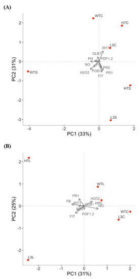 A PCA was performed to examine the behavior of the different parameters analyzed after Fusarium infection of the Arabidopsis WT, H7, and L3 lines at short (S) and long (L) time scales. The PCA score plots show the distribution of our experimental analyzes according to two principal components that accounted for more than half of the 56–64% variance in the 11/9 variables tested at short/long time scales (Figure 7). In addition, the PCA results show that the WT and Glb1-infected lines were completely separate from each other, which may be due to early defense gene induction. This can be observed in the biplot graph in Figure 7A, where both mutants infected at the short time scale are distributed according to the first principal component (PC1). At the long time scale, however, the parameters PR1 and FIT appear to be key parameters in the H7 and L3 line responses, respectively (Figure 7B).