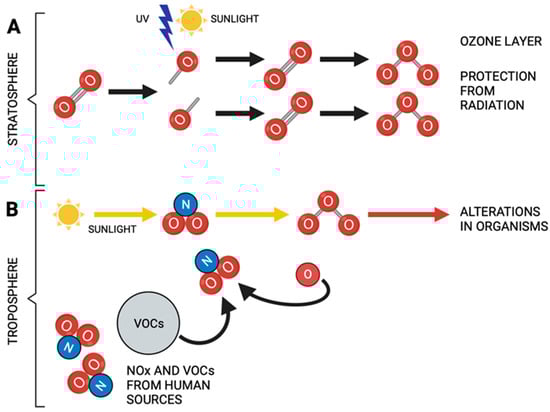 (A) Ozone plays a protective role in the stratosphere since it prevents the excessive passage of ultraviolet radiation to the earth. (B) Ozone acts as an atmospheric pollutant in the troposphere. Note the different functions of ozone when it is formed. Yellow arrows indicate ozone production from nitrogen species and solar radiation. Created in BioRender.com (accessed on 6 June 2023).