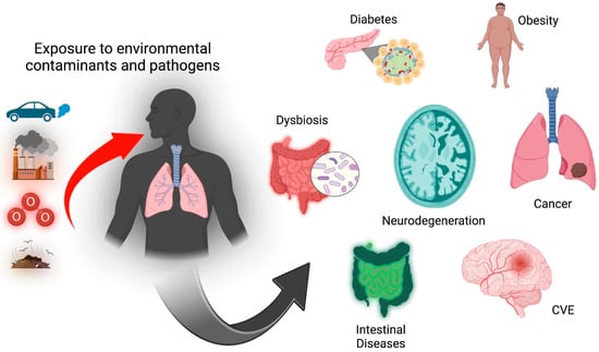 Environmental pollution is associated with developing various pathologies such as diabetes, obesity, neurodegenerative diseases (Parkinson’s, Alzheimer’s), cerebral vascular events (CVE), some types of cancer, and intestinal alterations as dysbiosis and intestinal diseases. Created in BioRender.com (accessed on 6 June 2023).