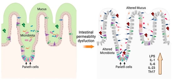 Epithelial architecture. Maintaining the intestinal barrier maintains the mucosa and the microenvironment of the microbiota. Paneth cells synthesize antimicrobial molecules that control the growth of pathogenic microorganisms. When the functioning of these cells, vesicles they produce and other factors are altered, intestinal permeability is lost, increasing the response of Th17 cells, generating an increase in IL-1β, IL-6, and LPS, among others, and establishing an inflammatory process. Created in BioRender.com (accessed on 6 June 2023).
