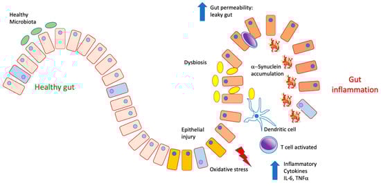 Alterations in gastrointestinal tract have been suggested as preceding changes in the brain; among these are dysphagia, increased salivation, delayed gastric emptying, and constipation [,], along with alterations in the microbiota and abnormal accumulation of α-synuclein in the gastrointestinal system. The intestine has an essential role as a barrier [], since it prevents the release of food antigens and inflammatory bacteria, preventing them from entering the circulation; however, when the barrier is altered, it becomes very permeable, releasing it into the torrent blood proinflammatory molecules [], which causes the lymphoid follicles of the mucosa to become activated; T and B lymphocytes found in Peyer’s patches adjacent to M cells proliferate as a process of stimulation by a specific antigen, releasing into the bloodstream. From there, they migrate to the lamina propria, and this is where the lymphocytes B are transformed into plasma cells, which produce specific secretory IgA against different antigens. IgA produced in the mucosa does not activate the complement pathway and does not cause inflammation []. In addition, an inflammatory process is induced when foods rich in antigens from pathogenic organisms such as bacteria are ingested. Matthew Stephens and Pierre-Yves von der Weid (2020) demonstrated that LPS from specific species of the bacteria Serratia marcescens, Pseudomonas aeruginosa, Klebsiella pnemoniae, and Salmonella enterica could differentially modulate TNFα through factor activation—core kB (NFkB) []. The intestine can distinguish between its own microbiota and pathogenic organisms. It is known that alterations between resident and pathogenic bacteria lead to an immune imbalance producing inflammation. It is accompanied by a loss of control of intestinal permeability that allows the release of bacterial LPS that reach the enteric nervous system, maintaining an inflammatory state, as occurs in CD and PD. Otherwise, it has been observed that patients with Parkinson’s disease show increased permeability in the colon (Figure 4), contributing to the systemic inflammatory process in patients with said disease.