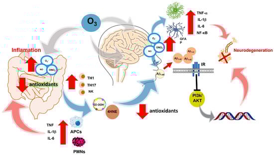 Exposure to O3 increases the production of ROS, which leads to the development of inflammatory bowel diseases associated with the increase of cytokines IL-6, IL-1β, and TNFα, as well as the activation of TH1, TH17, and NK cells responsible for cell maintenance; however, the increase in ROS, as well as the decrease in antioxidant defenses, limits the function of lymphocyte cells, generating peroxidized lipid adducts such as CE-OOH and 4HNE at the systemic level. This decreases antioxidant defenses and causes polypeptides such as βA to oxidize and generating oligomers of βA1-42, which interrupt the internalization of glucose. Survival pathways such as PI3K/AKT are then inhibited, causing neuronal cells to atrophy, which causes astrocytes and microglia to be activated. Proinflammatory cytokines causing neuroinflammation are released, which chronically leads to neurodegeneration of neurons in the hippocampus and cortical areas that is pathologically associated with gradual loss of memory. It is currently believed that discrete degenerative processes at the beginning of AD such as the deposition of highly insoluble βA and the accumulation of tau proteins-damage neurons, provide clear inflammatory stimuli to local microglia and the hippocampus.