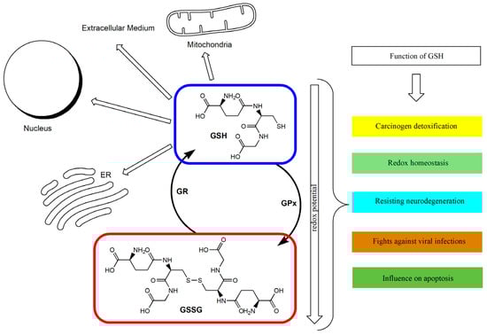 The tripeptide γ-l-glutamyl-l-cysteinyl-glycine, known as glutathione, is the main antioxidant in aerobic cells [24,25] and is considered the most prevalent non-protein thiol in mammalian cells [26]. Its intracellular concentration equals from 1 to 15 mM [27,28]. It occurs in the form of GSH and GSSG [29]. Glutathione is generated in the process of synthesis as a reduced form, which can generate GSSG, with which it equilibrates and determines the redox environment [30].