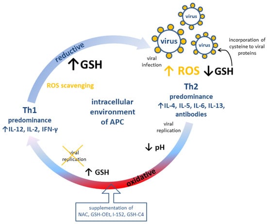 There are two types of T cell responses, namely T helper (Th) cell type 1 associated with cellular immunity (production of interleukin IL-12, IL-2, IFN-γ) and Th cell type 2 related to humoral immunity (production of IL-4, IL-5, IL-6, IL-13, and antibodies). It has been demonstrated that the redox potential of GSH, in contrast to antioxidants without sulfhydryl groups (e.g., vitamin C) [71], modulates Th1/Th2 immune response in T cells as well as in the antigen-presenting cells, i.e., macrophages, dendritic cells, and B cells [65,71,72]. Nevertheless, vitamin C was also claimed to participate in the immune response during an early phase of virus infection through the production of type I interferons [73]. The high level of GSH in the antigen-presenting cells correlates with the increased production of IL-12 favoring Th1 response [68], and probably reduces the disulfide bonds of an antigen, which is a crucial step of antigen processing. It also seems that the redox potential of GSH may increase the activity of thiol proteases essential in antigen processing and the cleaving of invariant chains from major histocompatibility complex class II, the main role of which is presenting processed antigens to CD4(+) T-lymphocytes [74,75].
