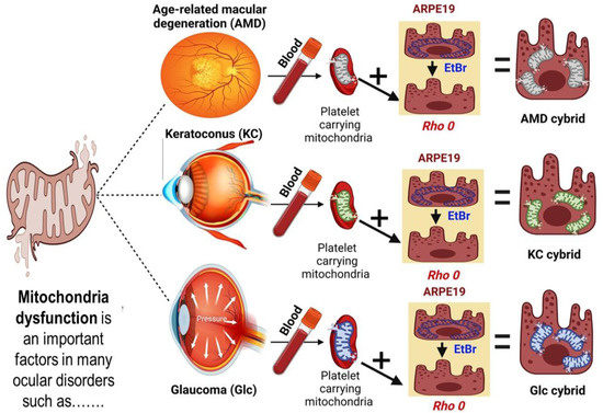 A growing body of evidence indicates a remarkable link between the aging process and alterations in mitochondrial function [6]. Lane et al. demonstrated that aging causes mtDNA damage and deterioration of mitochondrial respiratory capacity, resulting in increased levels of ROS [7]. A significant number of recent studies have demonstrated the potential role of mitochondrial changes as an effective factor in a variety of age-related diseases such as age-related macular degeneration, Parkinson’s, and Alzheimer’s diseases [8,9,10]. Our lab previously reported that transmitochondrial cybrid cell lines from patients with wet AMD had significant disruption of mitochondria functions, increased apoptosis, and cell death along with altered expression levels for complement, inflammation, and angiogenesis genes [11,12,13].