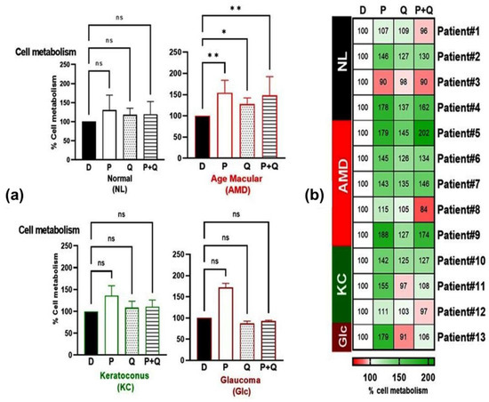 (a) Effect of PU-91, quercetin, and in combination on cellular metabolism of normal (NL), age-related macular degeneration (AMD), keratoconus (KC), and glaucoma (Glc) cybrids via MTT assay. MTT assay is used to measure cellular metabolism and cell viability. (b) Heatmap representation of the impact of PU-91, quercetin, and in combination on cellular metabolism in patients of normal (NL), age-related macular degeneration (AMD), keratoconus (KC), and glaucoma (Glc) cybrids. * Indicates p ≤ 0.033; ** ≤ 0.002, and ns means nonsignificant. In the heatmap representation, a percentage of more than 100% represents higher metabolic activity, indicating higher cell viability.