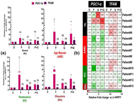 (a) Effect of PU-91, quercetin, and in combination on the mRNA expression of PGC-1α and TFAM genes in normal (NL), age-related macular degeneration (AMD), keratoconus (KC), and glaucoma (Glc) cybrids via qPCR. (b) Heatmap representation of the impact of PU-91, quercetin, and in combination on the mRNA expression of PGC-1α and TFAM genes in patients of normal (NL), age-related macular degeneration (AMD), keratoconus (KC), and glaucoma (Glc) cybrids. * Indicates p ≤ 0.033; ** ≤ 0.002, and ns means nonsignificant.
