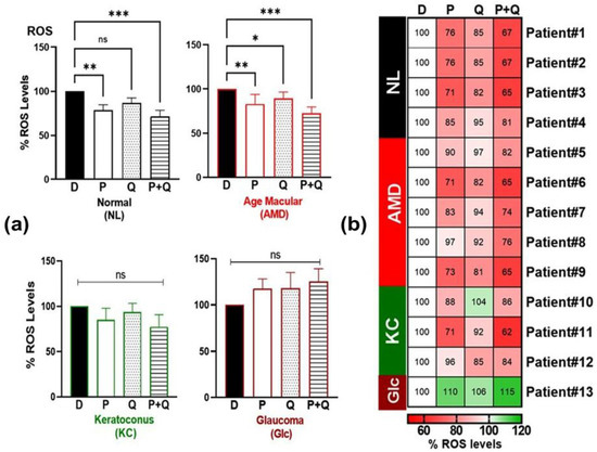 Mitochondria are a major source of cellular ROS production [25]. We determined whether PU-91 (P), quercetin (Q) alone, or their combination (P+Q) reduced ROS levels in the NL, AMD, KC, and Glc cybrids. Our results showed that treatment with PU-91 (P), quercetin (Q), and in combination (P+Q) significantly decreased the levels of ROS in AMD cybrid: 82% ± 3.25 (p-value = 0.002), 90% ± 3.21 (p-value = 0.014), and 72% ± 3.29 (p-value = 0.0002), respectively (Figure 4a). The NL cybrids also showed reduced ROS levels after treatment with PU-91 (78.5% ± 6.24, p-value = 0.0016) and P+Q treatment (71.2% ± 7.14, p-value = 0.0002) but no changes were seen in the KC or Glc cybrids. The heatmap showed individual variability in decreased ROS levels within the AMD and KC disease groups in response to PU-91 (P) or in combination (P+Q) treatments (Figure 4b).