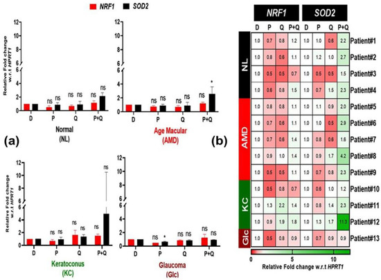 (a) Effect of PU-91, quercetin, and in combination on the mRNA expression of antioxidant genes such as NRF1 and SOD2 in normal (NL), age-related macular degeneration (AMD), keratoconus (KC), and glaucoma (Glc) cybrids via qPCR. (b) Heatmap representation of the impact of PU-91, quercetin, and in combination on the mRNA expression of NRF1 and SOD2 genes in patients of normal (NL), age-related macular degeneration (AMD), keratoconus (KC), and glaucoma (Glc) cybrids. * Indicates p ≤ 0.033, and ns means nonsignificant.