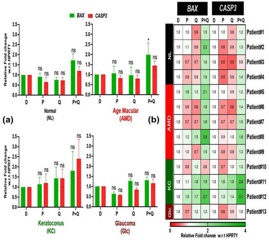 (a) Effect of PU-91, quercetin, and in combination on the mRNA expression of BAX and CASP3 genes in normal (NL), age-related macular degeneration (AMD), keratoconus (KC), and glaucoma (Glc) cybrids via qPCR. (b) Heatmap representation of the impact of PU- 91, quercetin, and in combination on the mRNA expression of BAX and CASP3 genes in the patients of normal (NL), age-related macular degeneration (AMD), keratoconus (KC), and glaucoma (Glc) cybrids. * Indicates p ≤ 0.033, and ns means nonsignificant.