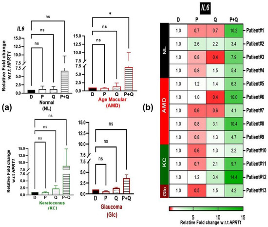 These findings show that the combination of P+Q induces significant upregulation of IL6, a proinflammatory in NL, AMD, KC, and Glc cybrids, making this combination likely harmful to the cell health. However, when the 200 µM PU-91 alone was administered, then the results showed no significant increase in IL6 expression (Figure 7a), but when viewed individually (heatmap) (Figure 7b), there was variability in the responses (patient #13, 0.5-fold decline, while patient #2 showed 2.6-fold increase). This type of variability of responses is consistent with our previous studies of AMD cybrids that had different mtDNA haplogroups [18,24].
