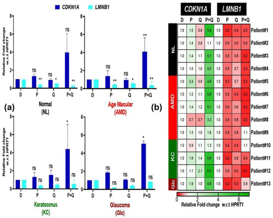 (a) Effect of PU-91, quercetin, and in combination on the mRNA expression of CDKN1A and LMNB1 genes in normal (NL), age-related macular degeneration (AMD), keratoconus (KC), and glaucoma (Glc) cybrids via qPCR. (b) Heatmap representation of the impact of PU-91, quercetin, and in combination on the mRNA expression of CDKN1A and LMNB1 genes in the patients of normal (NL), age-related macular degeneration (AMD), keratoconus (KC), and glaucoma (Glc) cybrids. * Indicates p ≤ 0.033; ** ≤ 0.002, and ns means nonsignificant.