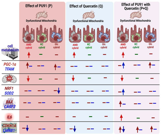 Schematic representation of the effect of PU-91 (P), quercetin (Q), and in combination (P+Q) on the age-related macular degeneration (AMD), keratoconus (KC), and glaucoma (Glc) on the cellular metabolism, ROS levels, expression of genes related to mitochondrial biogenesis, antioxidant genes, apoptotic genes, inflammatory gene, and senescence genes.