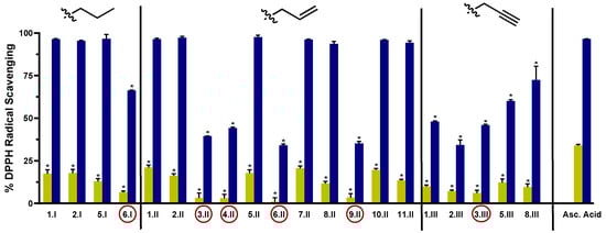 DPPH radical scavenging activity of the novel compounds at 0.003 mg/mL (light green) and 0.03 mg/mL (blue) at 120 min. Compounds with the red circle contain in their structure the double bond between the hetero- or carbo-cycle and the carbonyl of the acylselenourea. Significance: * p < 0.0001 compared to the ascorbic acid at the same concentration.