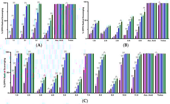 DPPH radical scavenging activity of the novel compounds at 0.03 mg/mL recorded at different points: 0 min (purple), 5 min (pink), 15 min (grey), 30 min (light blue), 60 min (dark blue), 90 min (light green), and 120 min (dark green). (A) Percentage of DPPH• scavenging of compounds from series I (propyl); (B) percentage of DPPH• scavenging of compounds from series III (propargyl); (C) percentage of DPPH• scavenging of compounds from series II (allyl). Significance: * p < 0.05, ** p ≤ 0.01, *** p ≤ 0.001, **** p ≤ 0.0001 compared to the previous time point. Results obtained for the 0.003 mg/mL are included in the Supplementary Material (Table S3 and Figure S100).