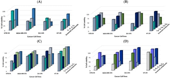 All the compounds were evaluated against a panel of breast (MDA-MB-231), colon (HT-29), lung (HTB-54), and prostate (DU-145) human tumor cell lines at two different concentrations (10 and 50 µM). The cell viability was determined after 48 h of treatment using MTT assay. The data are expressed as the percentage of cell growth ± SD in at least three independent experiments performed in quadruplicates (Figure 5 and Table S1).
