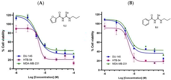 Compounds 1.I and 5.I exhibited the most potent activity with IC50 values in lung cancer cells (HTB-54) < 10 µM, along with high SI towards malignant lung cancer cells (SI of >12.7 and >11.9, respectively). On the other hand, compound 2.I, which contains a thiophene ring with propyl chain, showed high cytotoxicity against normal lung tissue. Derivatives 2.III and 8.III from series III (propargyl) showed anticancer activity with IC50 values of 11.6 and 21.7, respectively, against HTB-54 cells, with 8.III being more selective towards malignant lung cancer cells (SI of 2.3 and >4.6, respectively). On the other hand, the introduction of the allyl chain (compounds 7.II and 10.II) led to potent cytotoxicity against normal lung tissue cells (BEAS-2B) with IC50 values of 6.3 and 29.9 µM. Thus, the SI for these compounds was low (0.5 and 0.7, respectively). Additionally, compounds 1.I and 5.I, which exhibited the highest SI towards malignant lung cancer cells, were also evaluated against MDA-MB-231 (breast) and DU-145 (prostate) cancer cell lines (Figure 6). Both compounds showed similar IC50 values of 8.8 µM and 9.5 µM for compound 1.I, and 15.5 µM and 11.5 µM for compound 5.I, against MDA-MB-231 and DU-145, respectively. As shown in Table 1, these two derivatives showed similar IC50 values to cisplatin, even better for HTB-54 cells, along with SI > 20 times higher than cisplatin towards normal lung tissue. Cisplatin was chosen as a reference because it is one of the most widely used chemotherapeutic agents in the clinic.
