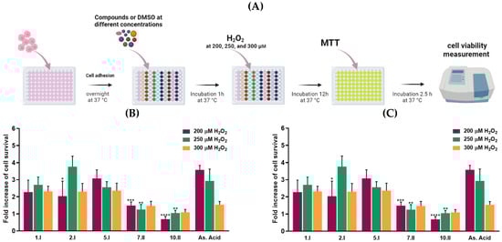 Cells were treated with the selected compounds and then oxidative damage to DU-145 cells was induced using different concentrations of H2O2 (200, 250 and 300 µM), and cell viability was assessed by the MTT method. Briefly, 2.5 × 104 DU-145 cells per well were added in 96-well plates. After 24 h of incubation, DMSO, 1.I, 2.I, 5.I, 7.II, 10.II, and ascorbic acid were added to each well at two different concentrations (0.0015 mg/mL and 0.0003 mg/mL) and incubated for 1 h. After that, H2O2 was added at the concentrations of 200, 250, and 300 µM, and the cells were incubated for 12 h to induce cell damage. MTT assay was used to measure cell viability. For each treatment, the mean cell viability was calculated from three independent experiments. The DMSO-treated controls were assigned with a cell viability value of 100% (Vcontrol). The results are expressed as a cell growth inhibition % caused by H2O2 and the increased fold of cell survival, as follows:
