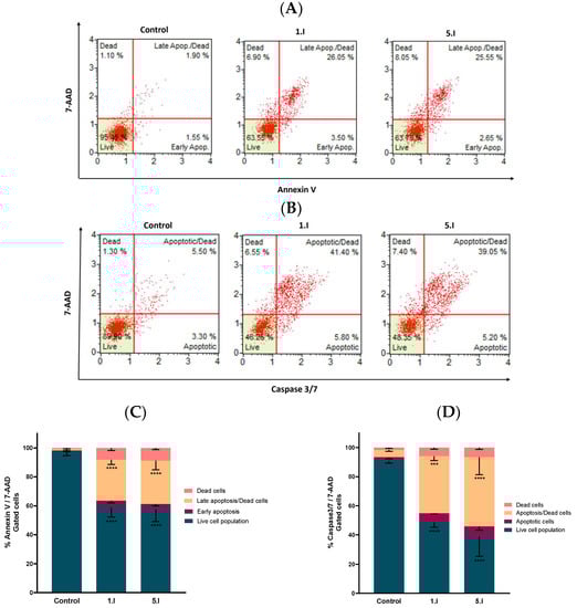 Compounds 1.I and 5.I induced apoptotic cell death in DU-145 cells. (A) Cells were treated with the concentration of 10 µM for 24 h and examined on a Muse™ automated cell analyzer with the Annexin V Live & Dead Cell apoptosis assay. (B) Analogous independent experiment performed with the Caspase 3/7 apoptosis assay. (C,D) Quantification of the cell population with the Annexin V & Dead Cell and Caspase 3/7 assays, respectively. Data are presented as the mean ± SEM of two independent experiments. **** p < 0.0001, *** p < 0.001 when comparing control and compounds.