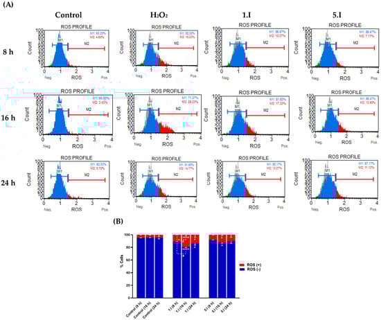 Acylselenourea derivatives have shown to exhibit good radical scavenging activity, as previously reported by our research group [11]. On the other hand, it has been described that the anticancer effect of certain Se-containing molecules is associated with increased total ROS levels [30]. Thus, to investigate whether the induced cytotoxic effect of 1.I and 5.I is related to ROS production, the total ROS level in DU-145 cells treated with 1.I and 5.I was performed. DU-145 cells were treated with DMSO, H2O2 (0.9 µM), 1.I (10 µM), and 5.I (10 µM) for 8, 16, and 24 h, and total ROS levels were measured. As shown in Figure 9, total ROS levels in cells treated with 5.I did not change significantly between the three time points, reaching at 8 h about 7%, and at 24 h about 11% of ROS(+) cells. Likewise, cells treated with 1.I exhibited a slight increase at 8 h in the ROS(+) cell population, reaching almost 20% compared to cells treated with 5.I. However, at 24 h, the percentage of ROS(+) cells decreased to about 12%. Therefore, no increase in ROS levels was observed that could be associated with the cytotoxic effect of 1.I and 5.I, supporting their possible role as radical scavengers. Previously, we evaluated the protective effect against H2O2-induced cell damage in DU-145 cells treated with 1.I and 5.I. Both the compounds showed protective activity against H2O2-induced oxidative cell damage at the concentration of 0.0015 mg/mL (equals to 5.78 µM and 5.57 µM for 1.I and 5.I, respectively), reaching a greater two-fold increase of cell survival. Therefore, a significant increase in total ROS levels may not be observed in cells treated with 1.I and 5.I at 10 µM, as they may be exerting radical scavenging activity.