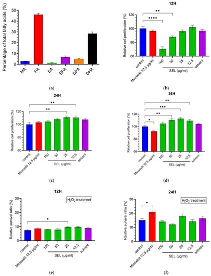 SEL promoted the proliferation and antioxidant capacity of DPC. (a) Composition of SEL. MA, Myristic acid (C14H28O2); PA, palmitic acid (C16H32O2); SA, stearic acid (C18H36O2); EPA, eicosapentaenoic acid (C20H30O2); DPA, docosapentaenoic acid (C22H34O2); DHA, docosahexenoic acid (C22H32O2). (b–d) DPC cell proliferation exposed to SEL (12.5, 25, 50, and 100 µg mL−1) is shown at 12, 24, and 36 h. Minoxidil as a positive control and solvent (0.2% DMSO/ethanol (1:1)) as a negative control were used. (e–g) The survival ratio of DPC exposed to H2O2 (100 µM) for 1.5 h. (h) The summary graph of the relative intensity of fluorescence on oxidatively damaged DPCs. (i) The images of the DCFH-DA probe fluorescence of oxidatively damaged DPCs. Control, no treatment; damage, treated with 100 µM H2O2; minoxidil, treated by 12.5 µg mL−1 minoxidil + 100 µM H2O2; SEL, treated with 100 µg mL−1 SEL + 100 µM H2O2. Data are presented as the mean ± standard error of the mean (SEM) (n = 3). * p < 0.05; ** p < 0.01; *** p < 0.001; **** p < 0.0001 vs. control.