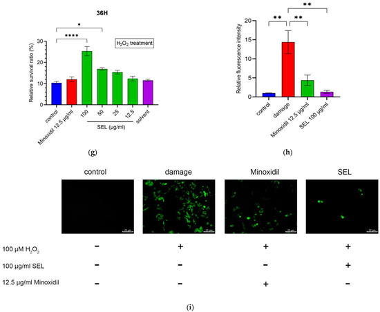 Oxidative stress and subsequent DNA damage are crucial for monitoring alopecia [44]. Therefore, DPCs were exposed to H2O2 after co-cultivation with SEL to explore the influence of SEL on antioxidant capacity. Results showed that 100 µM H2O2 resulted in 84.9% to 92.6% death for DPCs after exposure for 1.5h (Figure 1e–g). It is worth noting that, at 36 h, SEL (100 µg mL−1) significantly improved the antioxidant capacity of DPC, with the cell survival ratio reaching up to 25.4%, which was 2.45 times and 2.11 times higher compared with the control and minoxidil-treated group (Figure 1g).
