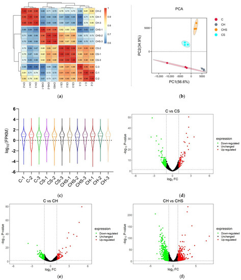 The sequencing results showed that the percentage of Q30 bases was 94.0% or more, and the comparison efficiency between each sample’s clean reads and the specified reference genome was 94.7% to 96.8% (Table S1). Furthermore, Pearson’s correlation analysis showed that samples within the same group were highly similar at R2 = 0.93~1.00, while samples in different groups were distinct (Figure 2a). The principal component analysis (PCA) score chart showed that four groups formed, showing precise classification among C, CS, CH, and CHS (Figure 2b). The violin plot showed that interquartile spacing, median, and gene expression distribution were nearly identical within the groups, indicating the high reproducibility of parallel samples (Figure 2c). These results demonstrate the transcription features’ separation among four groups, suggesting that RNA-seq data could be utilized for subsequent downstream analysis.