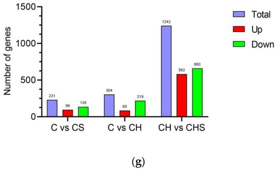 RNA-Seq data were used to find DEGs, and the gene expression levels with p-values of <0.05 and |log2 FC| ≥ 1 were considered as exhibiting a significant difference. A total of 1777 DEG genes were identified, with 96, 85, and 582 upregulated DEGs and 135, 219, and 660 downregulated DEGs in C vs. CS, C vs. CH, and CH vs. CDH groups, respectively (Figure 2d–g).