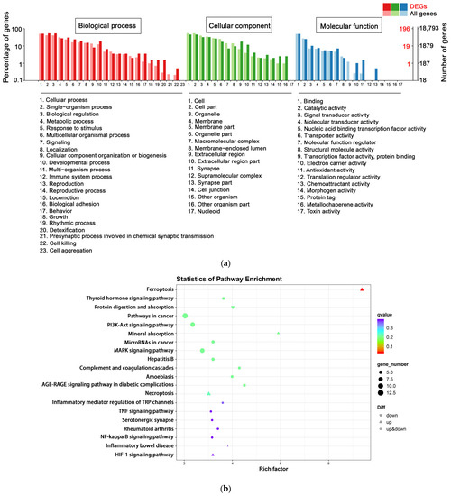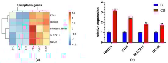 The identified DEGs were analyzed using KEGG to explore the biological functions and interactions of genes. In total, 106 C vs. CS group DEGs were integrated into the KEGG pathway database. The top 20 enriched pathways (with the smallest q-value) are shown in Figure 3b. The top three pathways are ferroptosis (five DEGs), thyroid hormone signaling pathway (five DEGs), and protein digestion and absorption (five DEGs). Notably, DEGs annotated into the ferroptosis pathway were all significantly upregulated. Ferroptosis is a novel regulatory cell death characterized by a high dependence on iron lipid peroxidation and is involved in various biological processes, including the biosynthesis of nicotinamide adenine dinucleotide phosphate (NADPH), oxidative stress, iron and lipid metabolism, glutathione (GSH), and coenzyme Q10 (CoQ10) [48].