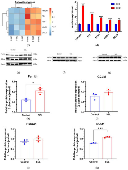 The gene expression level was verified at mRNA and protein levels. (a) The heatmap of transcription gene expression levels linked to ferroptosis in C vs. CS; (b) RT-qPCR validation of gene expression levels linked to ferroptosis in C vs. CS; C, cell without treatment; CS, cell treated with 50 µg mL−1 SEL. (c) The heatmap of gene expression levels related to antioxidation in CH vs. CHS; CH, cell treated with 100 µM H2O2; CHS, cell treated with 50 µg mL−1 SEL + 100 µM H2O2. (d) RT-qPCR validation of the transcript expression levels of genes related to antioxidation in CH vs. CHS. (e–k) The expression level of GCLM, ferritin, HMOX1, and NQO1 was assessed via the Western blotting technique. β-action is used as an internal parameter. The blue dot and the red box represent the protein expression level of the gene in the control group and SEL group, respectively. Each group has three biological replicates. Control, without treatment; SEL, cell treated with 50 µg mL−1 SEL for 36 h; HMOX1, heme oxygenase 1; SLC7A11, solute carrier family 7 member 11; FTL, ferritin L subunit; FTH1, ferritin heavy chain 1; NQO1, NAD(P)H quinone dehydrogenase 1; GCLM, glutamate–cysteine ligase modifier subunit. All data presented as the mean ± standard error of the mean (SEM) (n = 3). * p < 0.05, ** p < 0.01, *** p < 0.001, and **** p < 0.0001 vs. control.