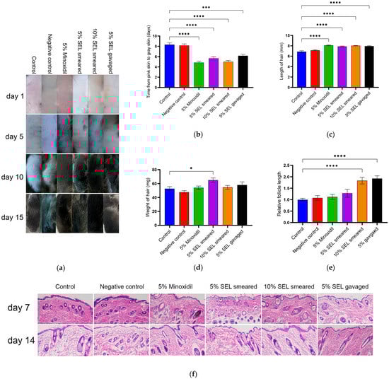 Currently, the commonly used drug for hair loss on the market is 5% minoxidil [13,59]; thus, we chose 5% SEL, including those smeared and gavaged for efficacy comparison. In addition, we also set a group of smeared 10% SEL to explore the effect of relatively high concentrations of SEL on the hair growth of C57BL/6 mice. Thus, in this study, 5% minoxidil was set as the positive control, and solvent (propylene glycol/absolute ethanol (1:1, V/V)) was set as the negative control. Compared to the control group, the gavage and smear administration of SEL significantly promoted hair regeneration in mice (Figure 5a). The time when the skin of mice changes from pink to gray comprises the telogen of hair follicles [60]. Compared with the control group, the telogen of the negative control group has no significant difference, indicating that the solvent does not affect the hair growth of mice. It is worth noting that SEL significantly shortened the telogen of hair follicles by 2.16–3.33 days compared with the control group (Figure 5b). Moreover, the new hair length of SEL-treated C57BL/6 mice was 14.4%–16.7% longer than the control group (Figure 5c). Regarding the weight of new hair, the 5% SEL smeared group dramatically increased by 23.4% compared with the control group (Figure 5d). New hair follicle length statistics showed that the new hair follicle length after the SEL treatment was 83.4%–92.6% higher than the control group and 70.1%–78.6% higher than the minoxidil group (Figure 5e,f). These results validate that SEL has a hair-growth-promoting property that is similar to minoxidil.