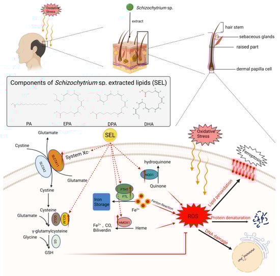 Alopecia has gradually become a problem that puzzles an increasing number of people. Dermal papilla cells (DPCs) play an important role in hair follicle (HF) growth; thus, exploring the effective chemicals or natural extracts that can remediate the growth of DPCs is vital. Our results showed that Schizochytrium sp.-extracted lipids (SEL) significantly promoted proliferation (up to 1.13 times) and survival ratio (up to 2.45 times) under oxidative stress. The treatment with SEL can protect DPCs against oxidative stress damage, reducing the reactive oxygen species (ROS) level by 90.7%. The relative gene transcription and translation were thoroughly analyzed using RNA-Seq, RT-qPCR, and Western blot to explore the mechanism. Results showed that SEL significantly inhibited the ferroptosis pathway and promoted the expression of antioxidant genes (up to 1.55–3.52 times). The in vivo application of SEL improved hair growth, with the length of new hair increasing by 16.7% and the length of new HF increasing by 92.6%, and the period of telogen shortening increased by 40.0%. This study proposes a novel therapeutic option for alopecia, with the effect and regulation mechanism of SEL on DPC systematically clarified.