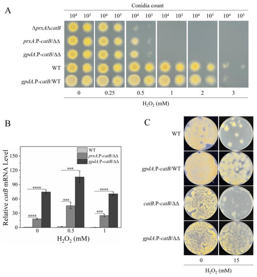 Our previous study has reported that ΔprxA conidia spotted on MM plates containing H2O2 exceeding 1 mM could not form surviving colonies [12,14], indicating that PrxA may also protect against H2O2 in the post dormant conidia stage. CatB activity has been reported to be developmentally regulated, was barely detectable in conidia, and started to accumulate 10 h after conidia inoculation [15,17]. Accordingly, it can be speculated that PrxA and CatB may functionally or cooperatively overlap in protecting fungal cells from H2O2 damage during the post dormant conidia stage, including conidia swelling and germination, young hyphae development, hyphae maturation, and conidiation. The H2O2 strains sensitivities lacking either or both PrxA and CatB at different growth stages were investigated to discriminate PrxA and CatB functions during the post dormant conidia stage.