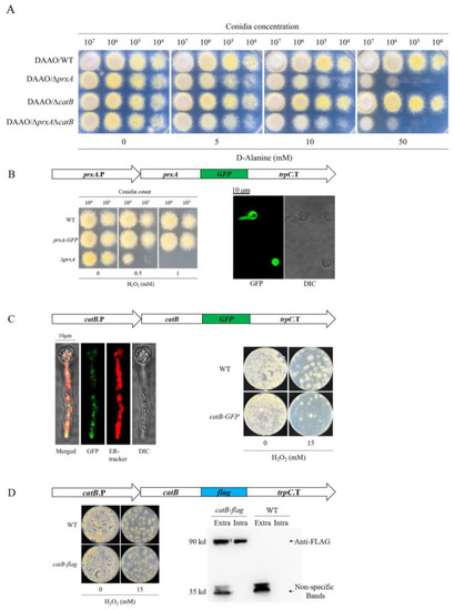 Based on the above results, we speculated that PrxA and CatB defend against H2O2 intracellularly and extracellularly, respectively. To verify this, the sensitivities of ΔprxA and ΔcatB to endogenous H2O2 were investigated. DAAO catalyzes the conversion of D-amino acids to their corresponding alpha-keto acids, producing H2O2 in the process. DAAO from the yeast R. gracilis has been successfully applied to specifically generate endogenous H2O2 in mammalian cells [28,29]. Here, we attempted to use this system in A. nidulans for the generation of endogenous H2O2. Expression of DAAO in WT (DAAO/WT) and ΔcatB (DAAO/ΔcatB) had no influence on the growth of the spotted conidia of both strains exposed to various concentrations of D-Ala (Figure 5A). In contrast, growth inhibition was detected on the DAAO-expressing ΔprxA (DAAO/ΔprxA) and ΔprxAΔcatB (DAAO/ΔprxAΔcatB) along with the increase in D-Ala concentrations in the media, confirming our speculation that PrxA rather than CatB counters the production of endogenous H2O2 (Figure 5A). Next, we investigated the cellular locations of the functionalized PrxA and CatB by the newly constructed GFP-tagged PrxA and CatB expression strains (prxA-GFP and catB-GFP) (Figure S7). The single copy of GFP was precisely inserted into the indicated genomic locus of prxA-GFP and catB-GFP strains as confirmed via Southern blotting (Figure S8). The fluorescence of PrxA-GFP diffused through all cells of the swelling and germinating conidia (Figure 5B), indicating that PrxA localizes to cytosol. The fluorescence of CatB-GFP in the mature hyphae was distributed as discontinuous spots (Figure 5C), indicating that it should localize to specific organelles. CatB-GFP partially coincided with the dyed endoplasmic reticulum (ER), indicating its ER retention (Figure 5C). However, no fluorescence was observed at the surface of hyphae, suggesting that CatB-GFP was not secreted to the cell wall, which does not agree with the predicted location of functional CatB. We speculated that the GFP tag may sterically hinder the secretion of CatB-GFP, leading to its accumulation in the ER. The CatB-GFP expression strains could not survive as did WT on plates containing 15 mM H2O2 (Figure 5C), further supporting our speculation. Contrary to CatB-GFP, the cytosol should be the right location of PrxA-GFP, since cytosolic PrxA-GFP defended against H2O2 just as PrxA did (Figure 5B).