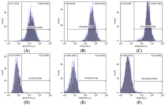 The phenotypic characterizations of hUC-MSCs were identified with flow cytometry. (A–C) The positive surface markers of hUC-MSCs were CD73 (98.9%), CD90 (99.95%), and CD105 (99.76%). (D–F) The negative surface markers of hUC-MSCs were CD34 (2.95%), CD45 (3.61%), and HLA-DR (3.69%).
