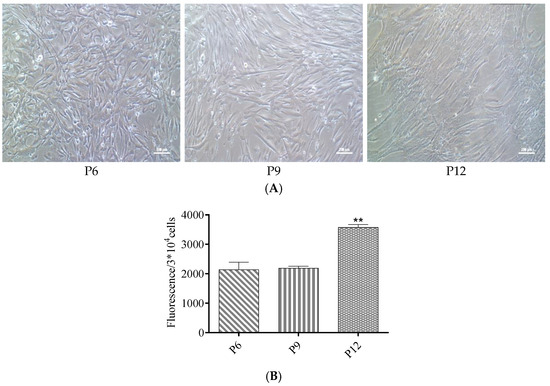 The cells were continuously cultured in a serum-free medium from primary isolation to passage 12. Cells of early passages displayed a small, spindle-shaped morphology. Cells after passage 11 showed a flatter, larger, and more irregular cell morphology (Figure 4A). Intracellular ROS levels in passages 6, 9, and 12 were detected using a luciferase spectrometer. The results showed that ROS levels increased with the increase of cell passages in late passages, and the ROS level increased 67% in cells of passage 12 compared with those of passages 6 and 9 (Figure 4B).