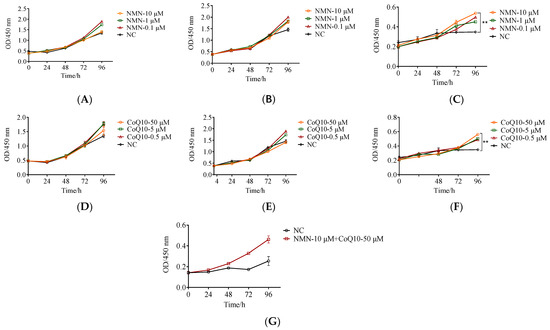 (A–C): Effects of different concentrations of NMN on cell growth at passages 6, 9, and 12. (D–F) Effects of different concentrations of CoQ10 on cell viability at passages 6, 9, and 12. (G) Effect of combined use of NMN and CoQ10 on cell growth at passages 12. Data are presented as mean ± SEM. Detect the absorbance value at OD450 nm, and the OD value is positively correlated with the number of surviving cells. ** p < 0.01 compared with the control group.