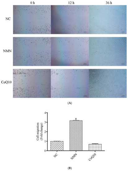 Effects of NMN and CoQ10 treatments on cell migration ability. (A) Cell migration images at 4 h, 24 h, and 36 h for control, NMN, and CoQ10-treated cells. (B) Fold change in migration activity after 36 h in comparison to control cells. The result is calculated according to the formula presented in 2.9. Data are presented as mean ± SEM. * p < 0.05 compared with the control group. Scale bar, 750 μm.