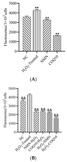 Effects of NMN and CoQ10 treatments on cellular ROS levels. (A) NMN and CoQ10 directly acted on cells for 24 h, and cellular ROS levels were determined. (B) The ROS level of cells in antioxidant pre-treatment and post-treatment mode. Data are presented as mean ± SEM ** p < 0.01 compared with the control (NC) group; && p < 0.01 compared with the H2O2-treated group.
