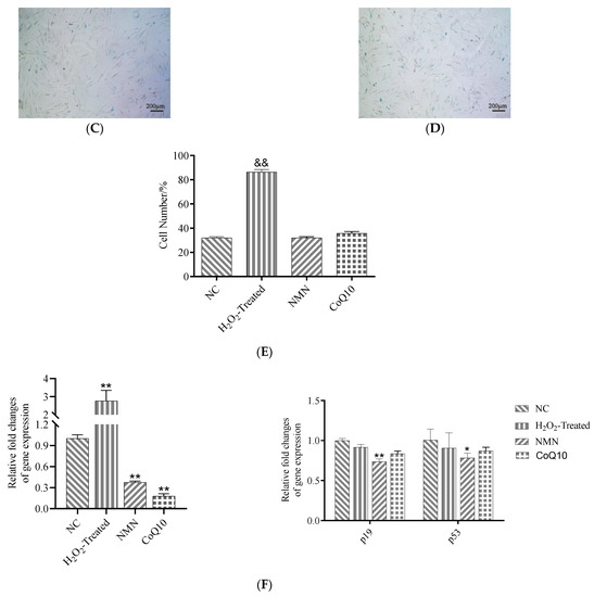 Effects of NMN and CoQ10 treatment on cell senescence. Representative images of SA-β-Gal staining cells of (A) the control group, (B) the H2O2-induced treatment group, (C) the NMN treatment group, and (D) the CoQ10 treatment group. (E) SA-β-Gal staining cell ratios of different treatments by image analysis. (F) Expression of cellular senescence-related gene foxe1, p19, and p53. Data are presented as mean ± SEM. * p < 0.05; ** p < 0.01; && p < 0.01 compared with the control (NC) group. Scale bar, 200 μm.