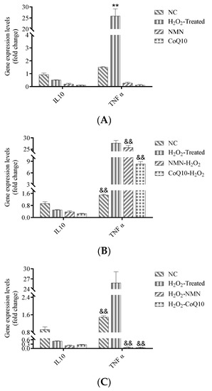 3.7. Increase of TNFα Gene Expression due to H2O2 Induction was Significantly Reduced by NMN and CoQ10