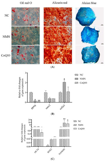 Effects of NMN and CoQ10 treatment on the differentiation potential of cells into three lineages. (A) Oil red O, alizarin red, and alcian blue staining of cells in the control group NMN and CoQ10 treatment groups. (B) Gene expression levels of adipogenic differentiation-related genes (pparg), osteogenic differentiation-related genes (runx2), and chondrogenic differentiation-related genes (col2A1). (C) Gene expression levels of stemness-related genes oct4, sox2, and nanog. Data are presented as mean ± SEM. * p < 0.05, ** p < 0.01 compared with the control group. Scale bar, 100 μm.