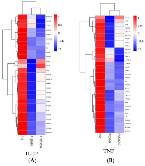 To further explore the antioxidant effects of both compounds, we focused on changes in the spectrum of inflammation-related genes and found that both compounds significantly modulated two inflammation-related pathways: the TNF signaling pathway and the IL17 signaling pathway (Figure 13 and Figure S2).