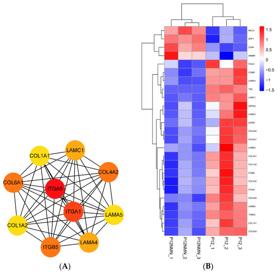 PPI network analysis of ECM receptor signaling pathway in downregulated DEGs in NMN treatment group. (A) PPI network analysis based on STRING database. The top 10 hub genes in the network ranked by the cytoHubba degree method were shown. The darker the color, the higher the score and importance of the gene. (B) Heat map of DEGs expression enriched in the ECM-receptor interaction pathway. Red colors indicate upregulated DEGs. Blue colors indicate downregulated DEGs.