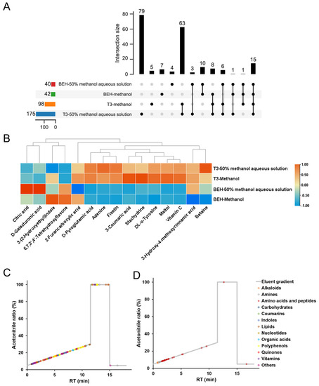 Effects of different extraction solvents and chromatographic columns on the quantities, intensity, and types of identified compounds in acerola powder samples. (A), the upset plot of the identified compound quantities in acerola powder samples. (B), the heatmap of peak area response of 15 compounds in acerola powder samples identified by all four methods. (C,D), the retention time (RT) and the corresponding mobile phase of identified compounds in acerola powder samples extracted by 50% methanol aqueous solution and separated by HSS T3 or BEH Amide, respectively.