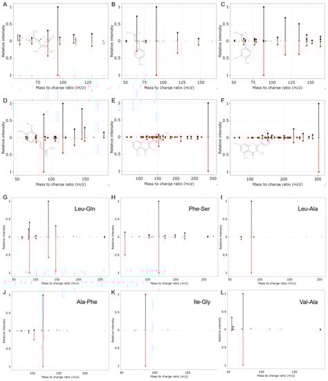 Another kind of component in acerola is phenolic compounds [25,26]. Phenolic compounds including benzoic acid derivatives (syringic acid, salicylic acid, etc.), phenylpropanoids (p-coumaric acid, caffeic acid, trans-ferulic acid, etc.), and flavonoids (kaempferol, quercetin, etc.) were identified in our acerola powder samples (Figure 5B–F). Previous studies also focused on abundant amino acids in acerola [16]. Interestingly, in addition to various amino acids, peptides were also identified in acerola powder samples. The mirror plots of representative peptides with an annotation level of 2 are shown in Figure 5G–L. On one hand, the peptides may naturally occur in acerola and go straight into the acerola powder. Fruit and vegetables and their products have low protein content, and acerola has even lower protein content ranging from 0.21% to 1.2% [27]. However, an increasing number of studies showed fruit and its products may be an important source of peptides, such as Tyr-isoLeu-Thr-Thr in organic tomato samples [28], 7 tripeptides in orange juice [29], and Arg-Thr-Asp in lemon juice [30]. On the other hand, it is worth noting that peptides or proteins in acerola powder may potentially be influenced by processing excipients used during the manufacturing process. Consequently, the exact source of the acerola powder peptides remains uncertain. Nevertheless, the discovery of these peptides in acerola powder represents a significant contribution to our understanding of the peptide composition within the fruit and its derived products.
