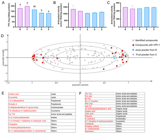 The analysis of quality and differential compounds in acerola juice powder and acerola fruit powder. (A), TPC in acerola powder samples. (B,C), antioxidant activity measured by assays of ABTS and DPPH in acerola powder samples. (D), the biplot of the PLS-DA model of peak area response in acerola powder samples. Data matrices for all samples were generated through 175 identified compounds. (E,F), the compounds with variable importance in projection (VIP) higher than 1 on the left and right of the biplot represent markers in acerola fruit and juice powder samples, respectively. Different letters of the same index represent significant differences (p-value < 0.05).