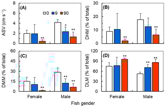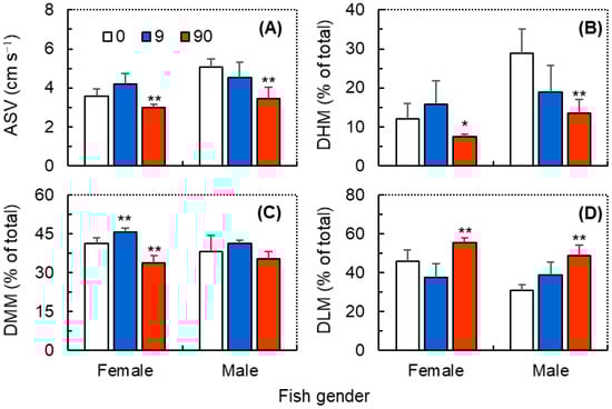 The locomotor behaviors of female and male zebrafish (Danio rerio) exposed to ZIF-8 NPs at 0 (control), 9.0, and 90 mg L−1. (A) average swimming velocity (ASV); (B) duration of high mobility (DHM); (C) duration of moderate mobility (DMM); (D) duration of low mobility (DLM). Data were measured within 10 min prior to the ball falling stimulation and are shown as mean ± SD (n = 3). Asterisks indicate significant differences between the exposure and control (* p < 0.05, ** p < 0.01).